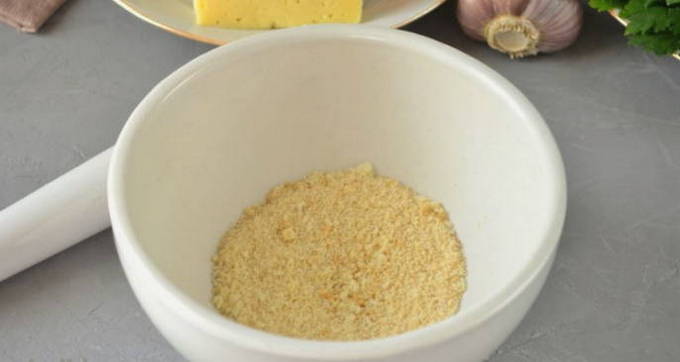 - We verspreiden de crackers in een vijzel of een gewone kom. Als er geen broodkruimels zijn en er is geen manier om ze te koken, vervang ze dan door broodkruimels.
