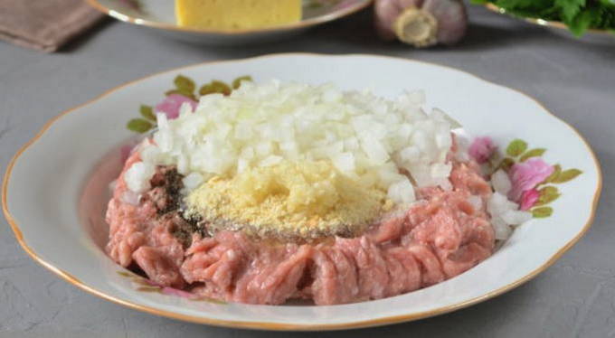 - We maken de ui schoon. Snijd zo klein mogelijk met een scherp mes. Hetzelfde doen we met knoflook (of persen met een knoflook). Voeg toe aan het vlees.