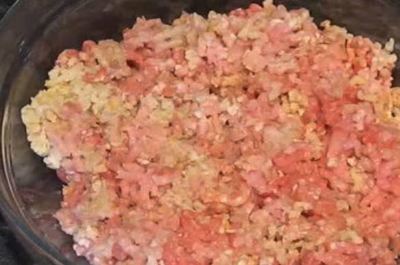 - Giet de gehakte crackers in een bord met gehakt.
