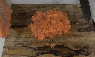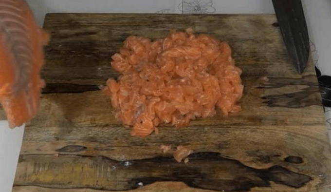 - Om dit gerecht te bereiden, is het beter om zelf gehakt te maken. Was de roze zalmfilet in koud water. We verwijderen overtollig vocht eruit met een handdoek. Zorg ervoor dat u de filets controleert op pitten. Snijd het in kleine blokjes. Probeer ze ongeveer even groot te houden. Maal geen vis met een vleesmolen. Hierdoor krijg je een veel betere smaak van de vis. Reuzel moet worden gehakt met een blender. Combineer het met de gesneden filets en roer.