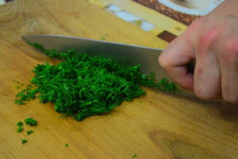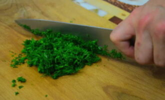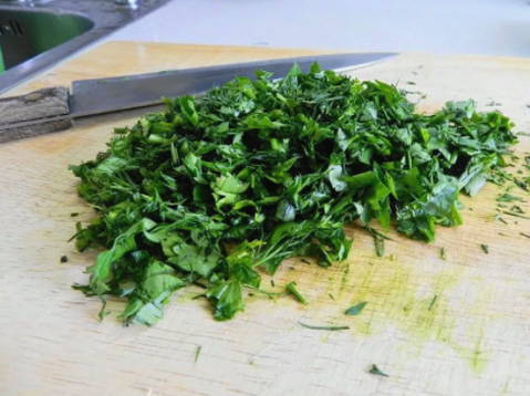 Spoel de dille en peterselie. Verwijder overtollig vocht van hen. Snijd de kruiden in kleine stukjes. Je kunt ook koriander, bieslook of basilicum gebruiken.
