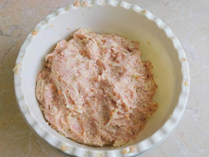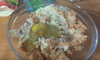 - Voeg viskruiden, zout en zwarte peper toe aan het gehakt. Kneed het gehakt goed met je handen en verdeel de kruiden. Daarna sturen we het 60 minuten naar de koelkast. Wil je het gehakt sappiger maken, voeg dan gesmolten boter toe. Maar als je de gerechten zo dieetrijk mogelijk wilt maken, dan moet je dit ingrediënt niet toevoegen.