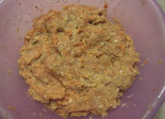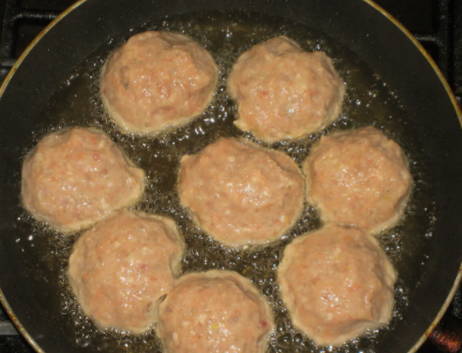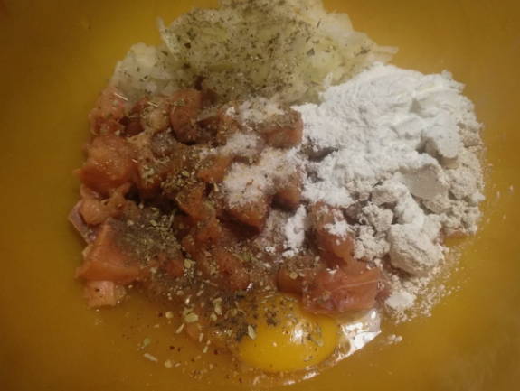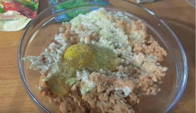 Doe de roze zalmfilets over in een diepe kom. Voeg er gekookte rijst aan toe. Roer ze goed tot een gladde massa. Klop een kippenei door het mengsel van gehakt en rijst. Voeg een halve theelepel gemalen zwarte peper en zout toe. Eventueel kun je een halve theelepel viskruiden toevoegen. Roer het gehakt opnieuw en verdeel de kruiden gelijkmatig. Het is het beste om het met je handen te roeren, niet met een lepel.