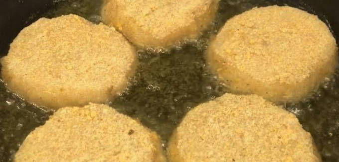 Als de pasteitjes helemaal gaar zijn, leg je ze op een bord. Serveer het gerecht warm.Als bijgerecht kunt u een aardappel- of groentesalade bereiden. Indien gewenst kunnen de schnitzels worden gegarneerd met verse kruiden of sesamzaadjes. Dit gerecht kan een heel licht en stevig diner zijn. Eet smakelijk!