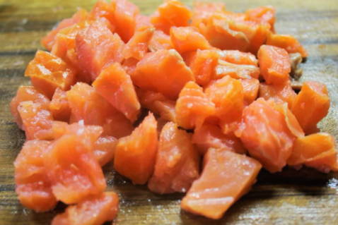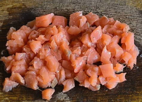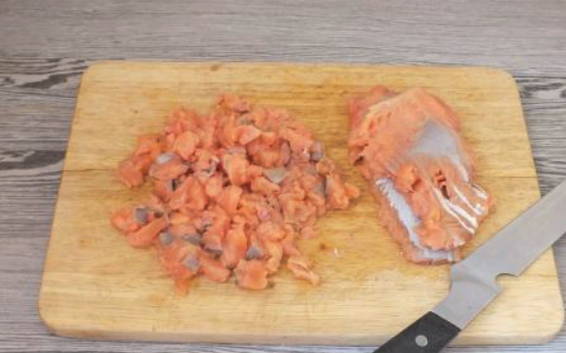 - Voor het koken moeten we de filets van roze zalm en koolvis verwerken. We wassen de vis goed in water. Overtollig vocht verwijderen we met keukenpapier. Probeer de filets volledig te zaaien. Als onderdeel van dit recept gaan we gehakte schnitzels maken. Daarom snijden we de filets in kleine blokjes van dezelfde grootte. Doe alles in een diepe kom en roer de twee soorten vis door elkaar.