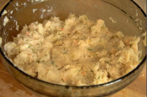 - Voeg bloem, zetmeel, gesnipperde uien en kruiden, gedroogde basilicum, zwarte peper en viskruiden toe aan het mengsel van roze zalm en loddefilets. Klop er dan 2 eieren door. Roer het gehakt om. Dit moet met uw handen worden gedaan, omdat het gebruik van een lepel in dit geval onhandig is. Voeg eventueel koriander of een van je favoriete kruiden toe. Stuur het gehakt 30-40 minuten naar de koelkast.