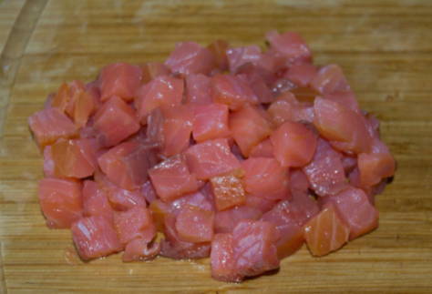 - Koop roze zalmfilets om het kookproces te versnellen. Hierdoor hoeft u geen tijd te verspillen aan het snijden van vis. Er kunnen botten in het gehakt zitten, maak de filets dus goed schoon. Spoel het af in koud water en dep het droog met een handdoek. Snijd de vis in kleine blokjes. Ze moeten ongeveer 1 centimeter groot zijn. Probeer ze even groot te maken. Breng de vis over naar een kleine maar diepe kom.