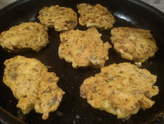 - Zet de pan op het vuur en laat opwarmen. Voeg er plantaardige olie aan toe. Leg de pasteitjes neer, met een kleine afstand ertussen. Bak elke kant ongeveer 7 minuten. Als gevolg hiervan moeten de schnitzels bruin worden. Dek ze vervolgens af met een deksel en laat nog 10 minuten staan, gedurende deze tijd zijn ze helemaal gaar.
