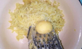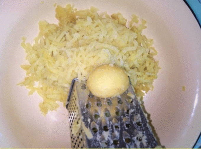 - Kook vervolgens het ei. Om dit te doen, giet je koud water in een kleine steelpan, leg je het ei voorzichtig in de pan en zet je het in brand. Voeg een theelepel zout toe aan het ei, zodat het niet barst tijdens het koken. Na het koken, kook gedurende 10 minuten. Nadat de aangegeven tijd is verstreken, giet u onmiddellijk het water uit de pan en vult u het ei met koud water. Door dergelijke temperatuurdalingen zal de schaal gemakkelijk achter het ei blijven, wat het reinigingsproces aanzienlijk zal vergemakkelijken. Wrijf het ei op een grove rasp en voeg het toe aan het gehakt. Voeg naar smaak zout, peper en je favoriete kruiden toe. Mix alles goed tot een glad geheel.