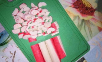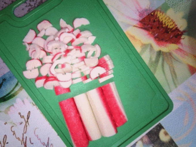 Snijd de krabsticks op de manier zoals op de foto. Je kunt het ook op een grove rasp raspen. Voeg vervolgens de krabsticks toe aan de aardappelen.