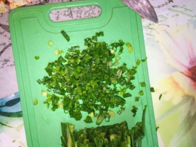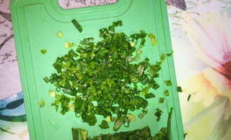 We wassen de groene uien goed onder stromend water, drogen ze af met een papieren handdoek. Hak fijn en voeg toe aan het mengsel van krabsticks en aardappelen.