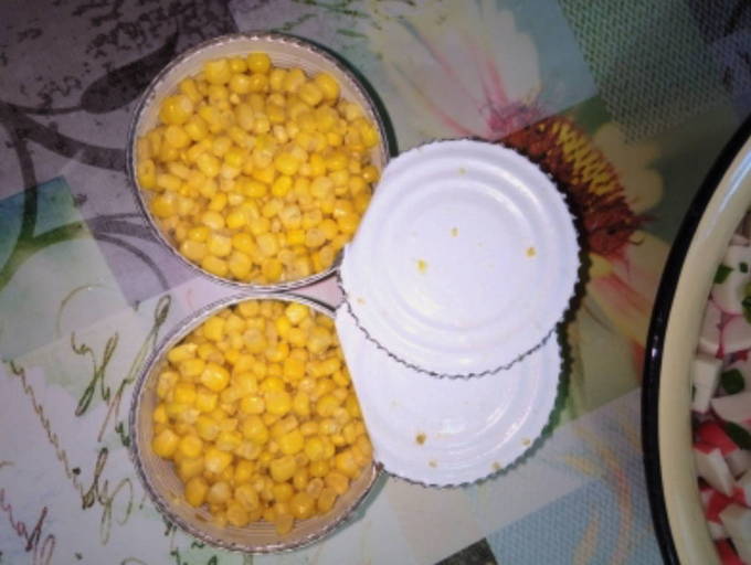 Giet de pekel uit de pot maïs en stuur deze vervolgens ook naar de kom met de rest van de ingrediënten.