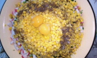 - Voeg het ei en de mosterd toe aan de krabsticks, meng alles goed tot een glad beslag. Voeg zout, peper en kruiden naar smaak toe, meng opnieuw.