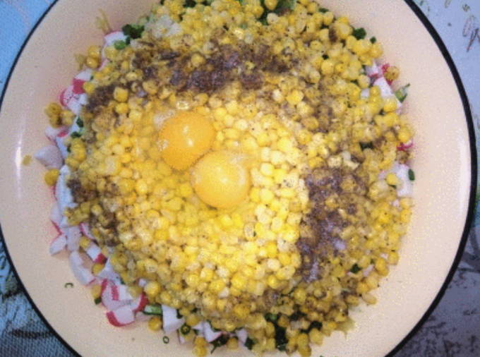 - Nu combineren we krabsticks, die vooraf werden gehakt, geraspte kaas, eieren, gehakte knoflook in het gehakt, voeg zout en peper naar smaak toe. Je kunt alle kruiden toevoegen die je lekker vindt. Meng alles goed. Voeg door een zeef gezeefde bloem toe en meng alles opnieuw. Je zou een mooie massa moeten krijgen, zoals op de foto.
