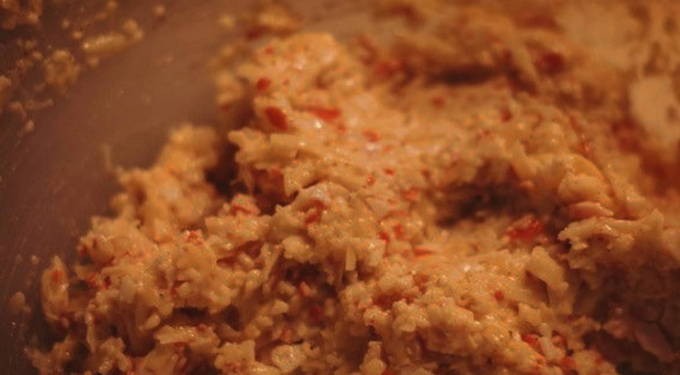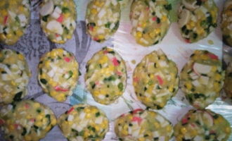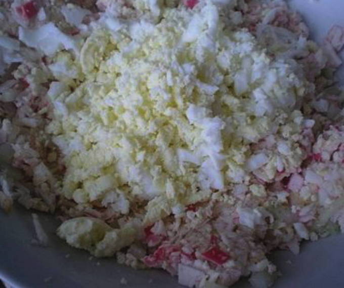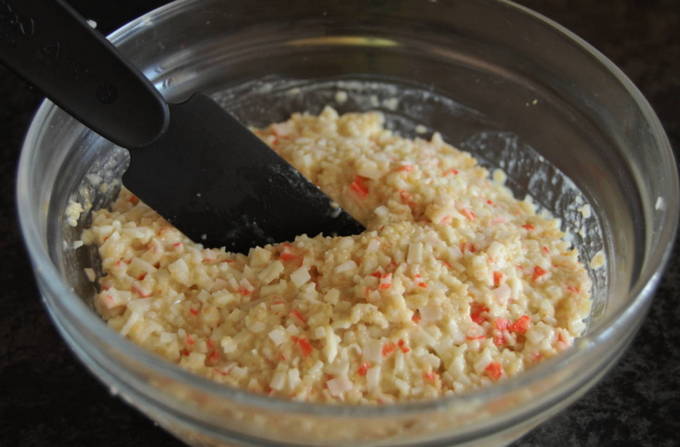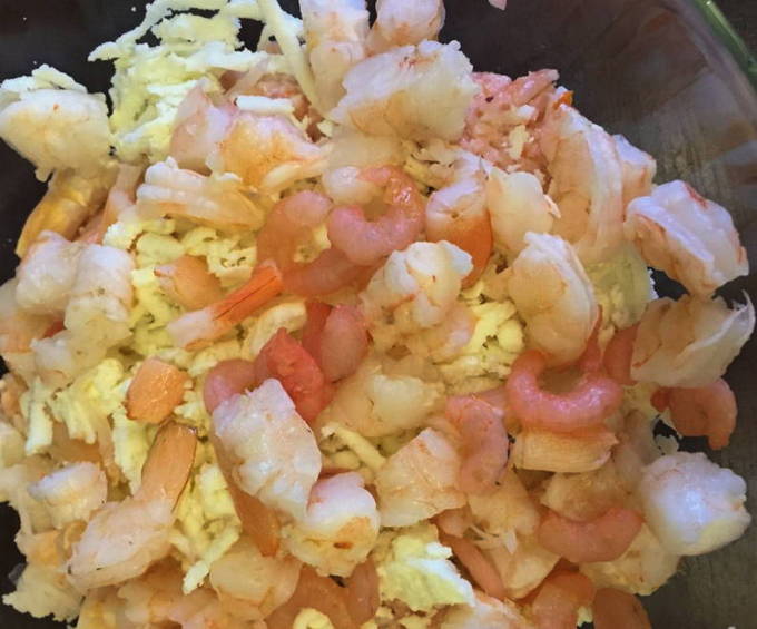 - We schillen ook de gamba's, in grote stukken gesneden. Als de kaas hard genoeg is, kan deze op een grove rasp worden geraspt.Voeg alles toe aan de massa met krabsticks, voeg het ei toe en meng alles goed door elkaar.