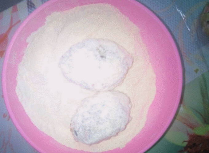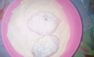 De volgende stap is het bereiden van een mengsel van bloem en zetmeel. Meng bloem en zetmeel in een aparte container. We kiezen de capaciteit waarin het handig is om de schnitzels te rollen. Rol de gevormde schnitzels van alle kanten grondig in een mengsel van bloem en zetmeel.
