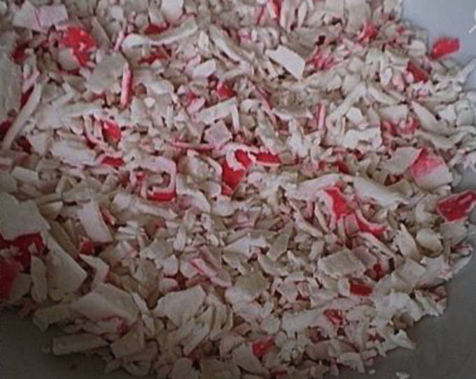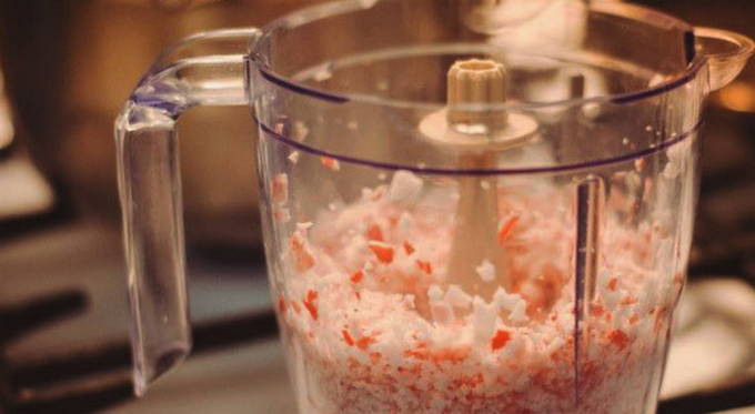 - We beginnen met koken met het hoofdingrediënt - krabsticks. Maal de krabsticks in een blender zodat de resulterende massa eruitziet zoals op de foto. Als er geen blender bij de hand is, kun je krabsticks raspen op een grove rasp. Maar als u besluit ze te raspen, moet u eerst de krabsticks invriezen. Dit is nodig om het wrijfproces te vergemakkelijken.
