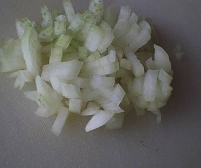 - Snijd de ui in kleine blokjes. Je kunt een uiensnijder gebruiken. Voeg de ui toe aan de gehakte krabsticks.
