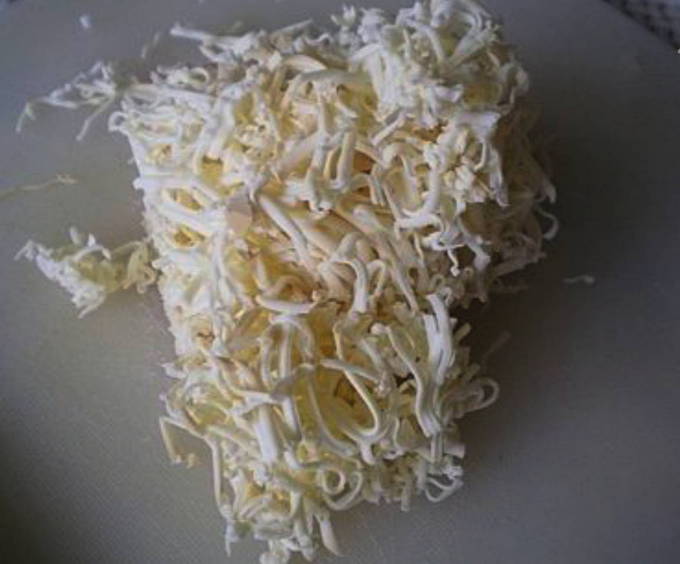 - Rasp de kaas. Kan zowel grof als fijn worden ingewreven. Als je op een fijne rasp wrijft, worden de schnitzels iets luchtiger. Combineer kaas met gehakte krabsticks en uien. Meng alles goed.