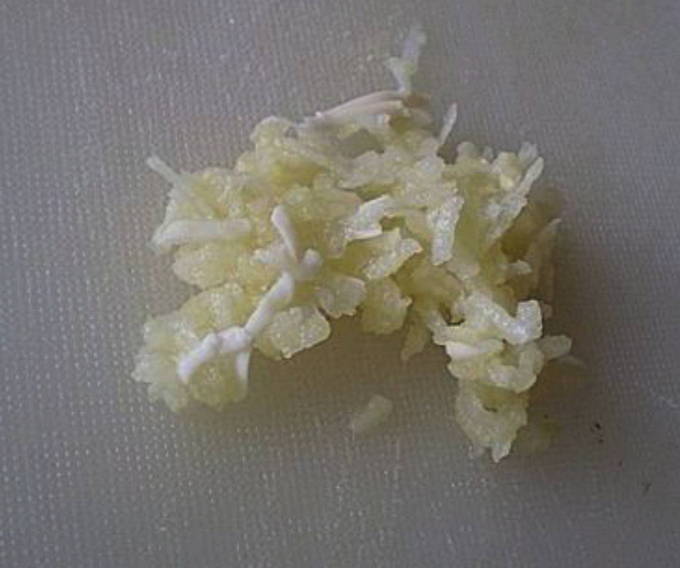 - Pel de knoflook. Gebruik een knoflookpers of een fijne rasp, maal het en voeg het toe aan het resulterende gehakt.