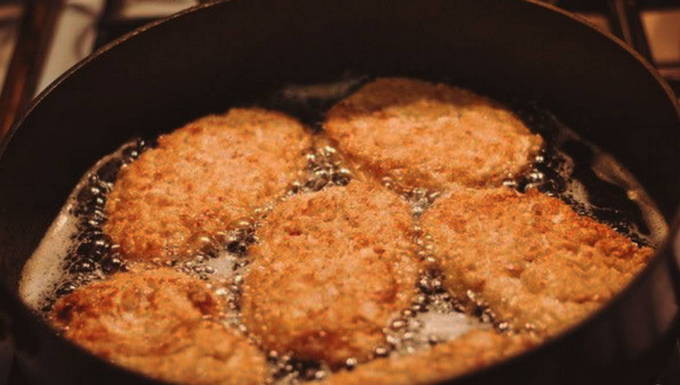 - Laten we beginnen met frituren. Verwarm hiervoor de pan van tevoren, waar we een kleine hoeveelheid plantaardige olie gieten. We vormen koteletten, in een voorverwarmde pan gedaan. Bak de schnitzels in 10 minuten aan elke kant goudbruin. Dek dan af en laat nog 10 minuten sudderen.