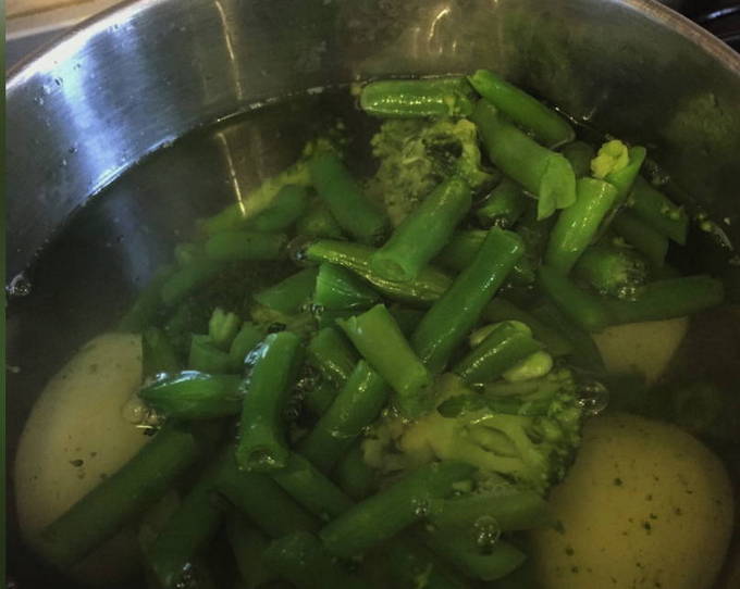 - Laten we beginnen met koken. Was grondig en kook de aardappelen in een beetje water gedurende 30 minuten na het koken. We controleren de gereedheid van de aardappelen met een mes, als de aardappelen in het midden zacht genoeg zijn, dan zijn ze klaar. Voeg bonen en broccoli toe aan bijna gekookte aardappelen, die eerder onder stromend water waren gewassen.