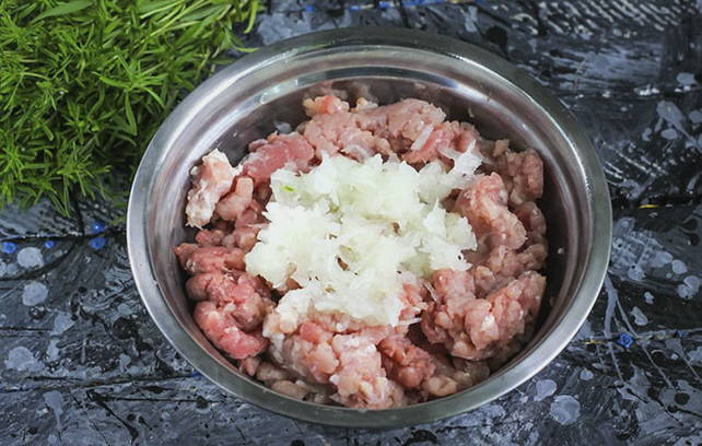 - Doe het gehakt in een kom, voeg er fijngehakte uien aan toe.