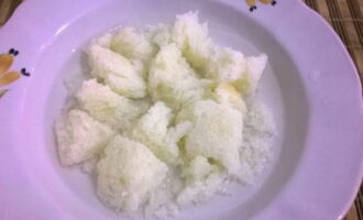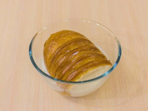 Snijd de korst van het brood en laat het vruchtvlees 5 minuten in koud water weken. Knijp vervolgens het brood uit het vocht.