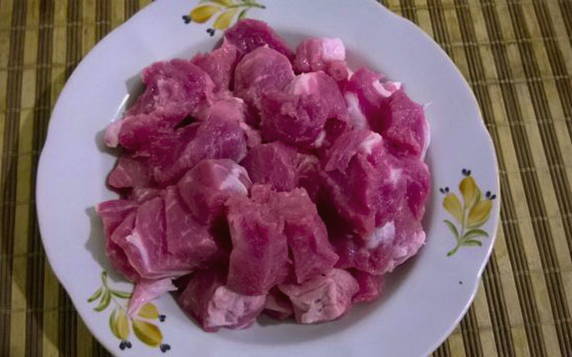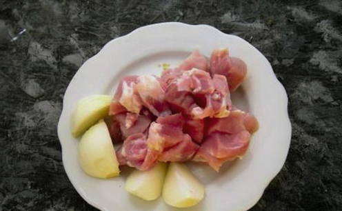 - Was het varkensvlees en dep het met servetten, snijd het in grote blokjes. Snijd de ui in vier stukken.