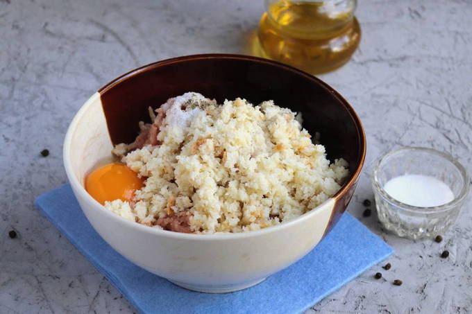 - Snijd de korsten van het brood en laat het 5-7 minuten in melk weken, pureer het tot een pap en voeg toe aan het gehakt. Rasp ui en knoflook op een fijne rasp of blader door een vleesmolen. Breek het kippenei in een kom en breng op smaak met zout en breng op smaak.