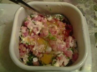 - Snijd het varkensvlees fijn met een mes. Doe het vlees in een kom, voeg zetmeel, mayonaise, zout, gemalen peper, ei, gehakte kruiden, ui en knoflook toe.