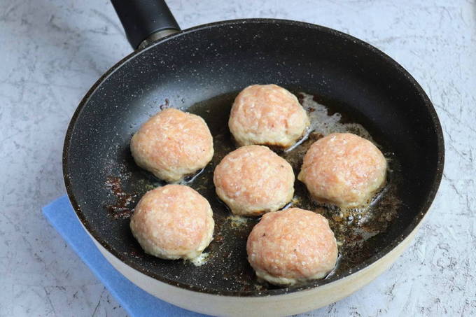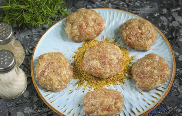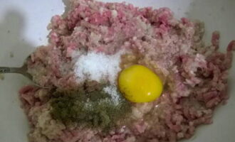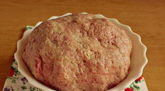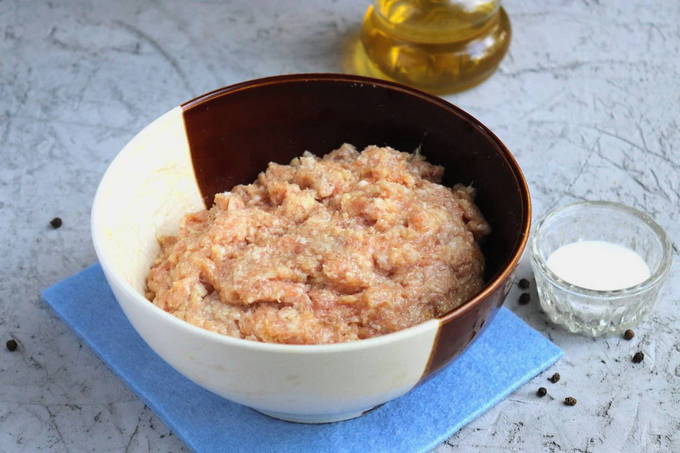 - Doe het gehakt in een kom, voeg zout en gemalen peper toe, meng. Vorm kleine pasteitjes.