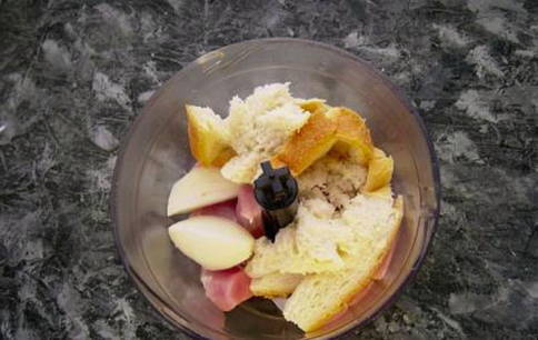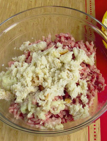 - Week het brood 5 minuten in koud water. Doe vlees, uien en brood in een blenderkom. Maal de ingrediënten.