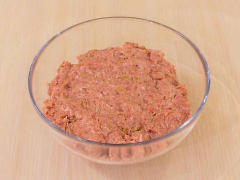 - Kneed het gehakt met je handen en druk op de bodem van de kom. De massa moet homogeen en stroperig blijken te zijn.