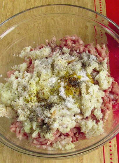 - Rasp ui en knoflook op een fijne rasp of hak ze fijn in een blender. Voeg groenten toe aan het gehakt, voeg kruiden, peper toe en meng goed.