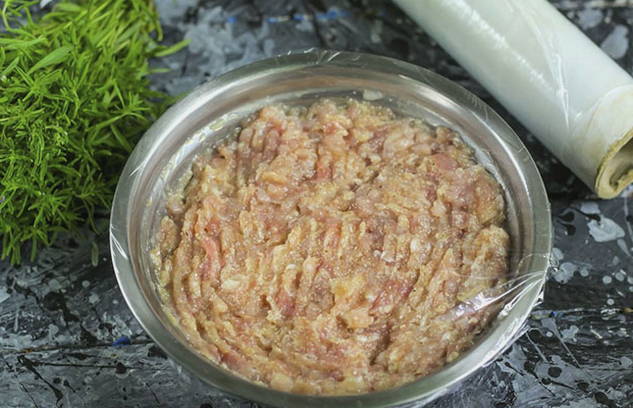 - Kneed het gehakt tot het glad is, dek de kom af met huishoudfolie en zet het een uur in de koelkast om het graan te laten zwellen.