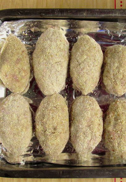 - Vorm schnitzels van gehakt, rol ze door paneermeel en leg ze op een bakplaat.