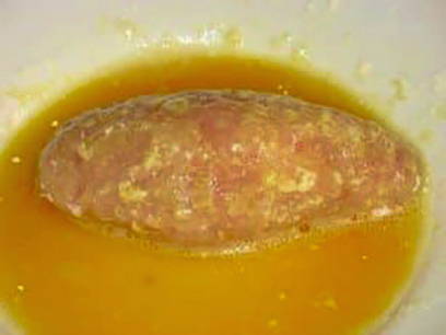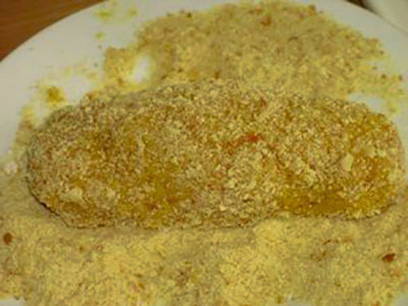 - Rol ze vervolgens door paneermeel. Dompel het vervolgens opnieuw in de eiermassa en opnieuw in het paneermeel.