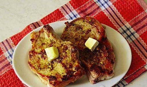 - Als de koteletten zonder bot klaar zijn, leg er dan een klein stukje boter op en serveer met de gebakken uien.