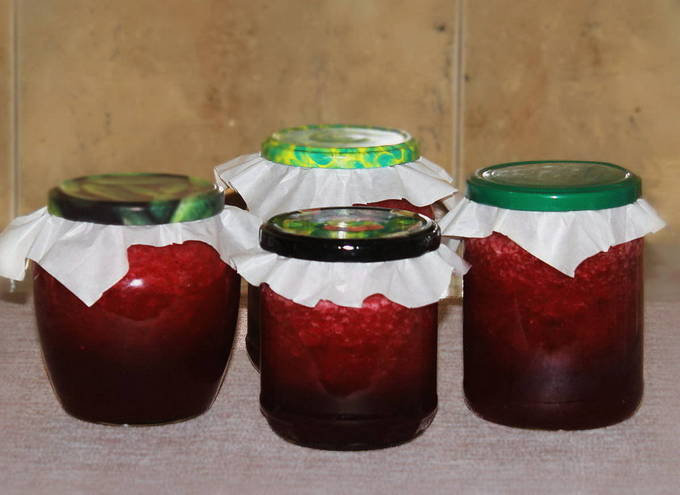 - Verdeel de resulterende bessenmassa in voorbereide potten en laat het afkoelen, waardoor het dikker en elastischer wordt. Sluit de krenten die op deze manier zijn bereid, calqueerpapier in twee lagen en stevig vastgebonden met een draad.