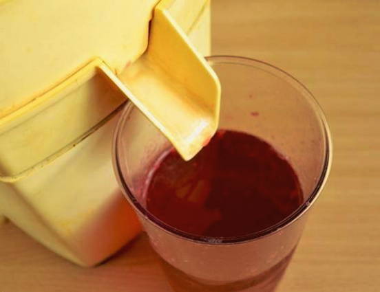 - Maal de krenten met een vleesmolen of blender en pers het sap met gaas uit de massa.