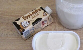 - Voeg de slagroom in porties toe aan het gecondenseerde melkmengsel en kneed na elke toevoeging met een spatel. In dit stadium hoef je niets te kloppen, het is voldoende om de opgeklopte massa's goed te combineren. De bereide kaasroom zetten we een uurtje in de koelkast zodat het stabiliseert en sterker wordt, waarna het al gebruikt kan worden.