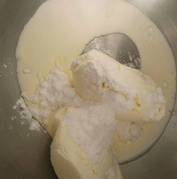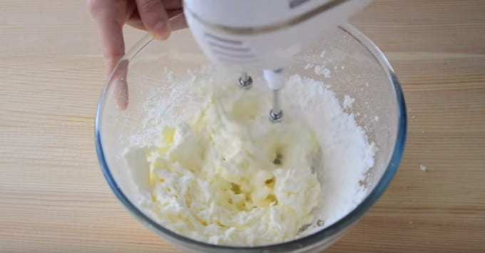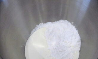 - Doe de roomkaas in een grote beslagkom en voeg de poedersuiker toe. Begin met een mixer op lage snelheid te kloppen en verhoog geleidelijk de snelheid. We bereiken een homogene gladde massa. Dit duurt ongeveer twee tot drie minuten continu kloppen.