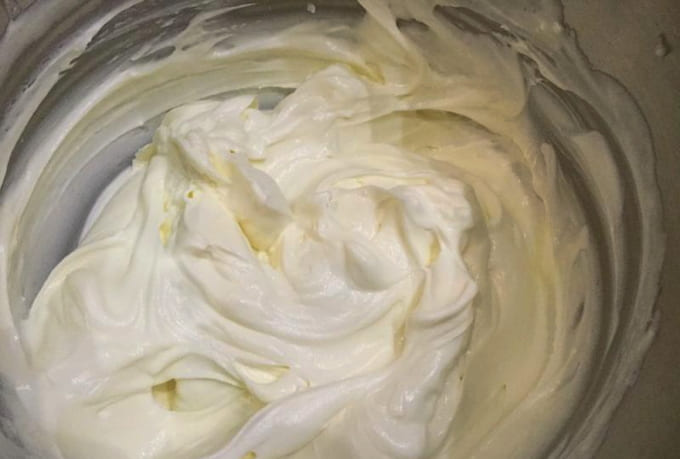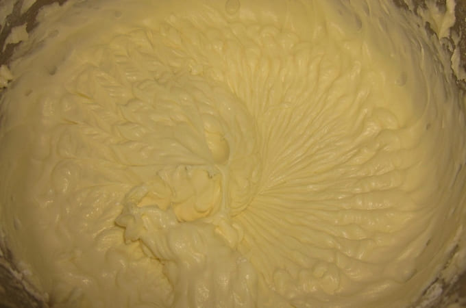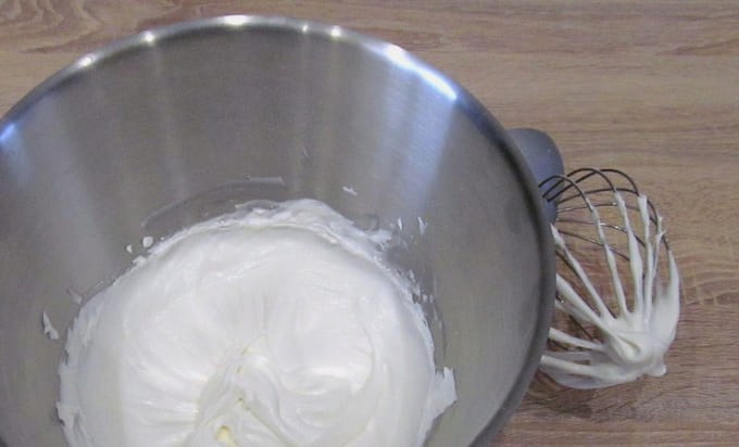 - Giet de gekoelde room in de resulterende massa en blijf kloppen. Het is belangrijk om het moment hier te vangen: zodra de crème goed indikt en een dichte consistentie aanneemt, moet het werk worden gestopt, omdat het risico bestaat dat de delicate crème overheerst.