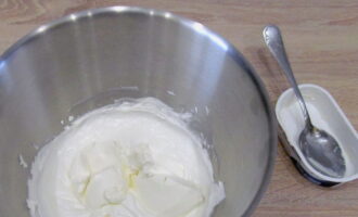 We introduceren roomkaas. Doe een of twee eetlepels roomkaas in de romige massa en klop de room tot een gladde massa. Dus voegen we de volledige hoeveelheid kaas toe.