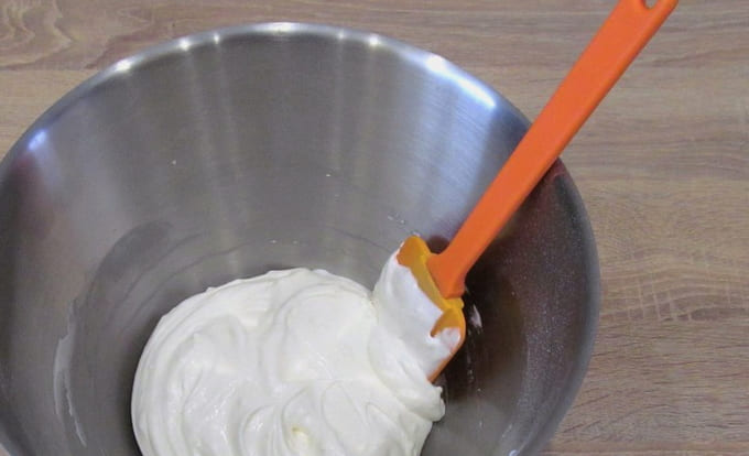 - Klop in een aparte kom de gekoelde room en de poedersuiker tot een dikke, luchtige massa.Zodra de slagroom spikes begint te vormen, stopt u met kloppen om de delicate structuur niet te verstoren.