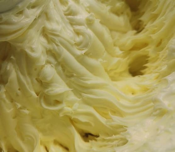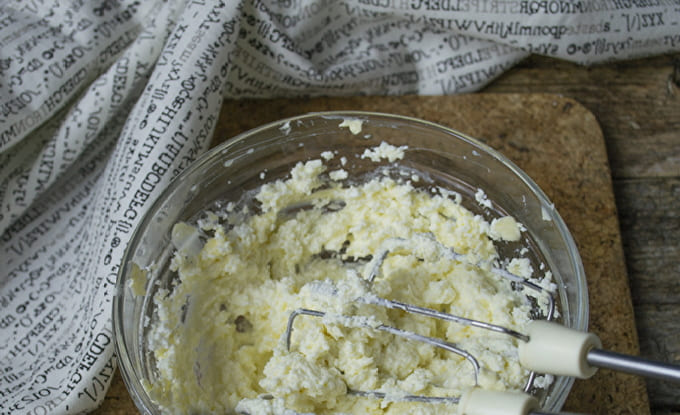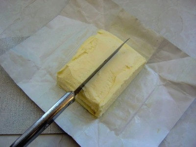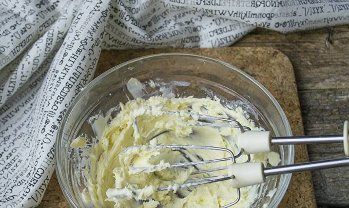 - Voordat u de room gaat bereiden, moet de boter uit de koelkast worden gehaald, zodat deze goed zacht wordt en plastisch wordt. Het product moet van hoge kwaliteit zijn: we zoeken alleen crème in de samenstelling. Als de boter een uitgesproken gele tint heeft, zal de afgewerkte roomkaas niet puur wit zijn.