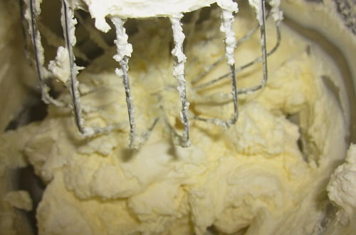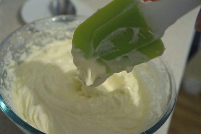 - Klop de room ongeveer vijf tot zeven minuten. Wanneer een stabiele consistentie en matte textuur is bereikt, zoals op de foto, stoppen we met werken. Het is te zien hoe goed de massa zijn vorm behoudt.