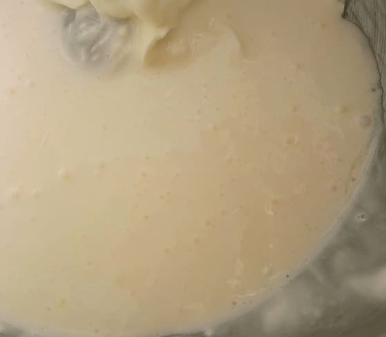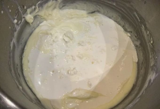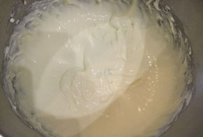 - Giet de gecondenseerde melk beetje bij beetje bij de opgeklopte boter, zonder te stoppen met werken met een mixer. Na het toevoegen van het volledige volume gecondenseerde melk, klop nog eens drie tot vier minuten zodat de massa verzadigd is met zuurstof en weelderig wordt. Voeg vervolgens een lepel mascarpone toe aan de massa en blijf kloppen. Als alle componenten zijn aangesloten, stoppen we met werken.
