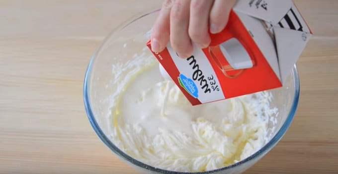 Na de introductie van het hele volume roomkaas, klop de room nog een minuut of twee. De consistentie van de massa moet glad en dik zijn en zijn vorm behouden. Zet de bereide room minimaal vijfenveertig minuten in de koelkast. Gedurende deze tijd zal de crème iets dikker worden en stabiliseren.